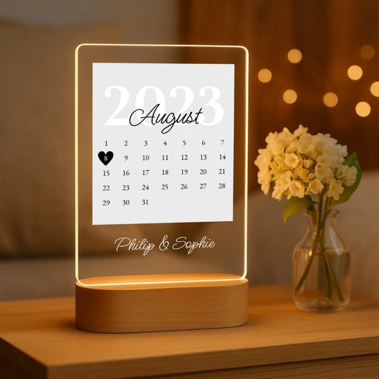 Unser Kalenderdatum - Personalisiertes Nachtlicht mit LED-Holzfuß (14x20)